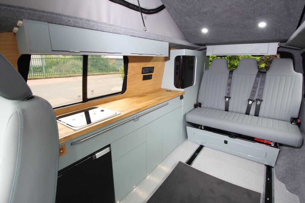 Smartbed 3 seat rail bed on extra lwb rails for maximum boot space. Full bespoke starlight campers 12v and 240v hook up system and leisure battery, fully insulated birch ply door cards , sink 2 burners elevating tuv approved roof dimmable interior lighting finished in smoke trim and altro flooring.