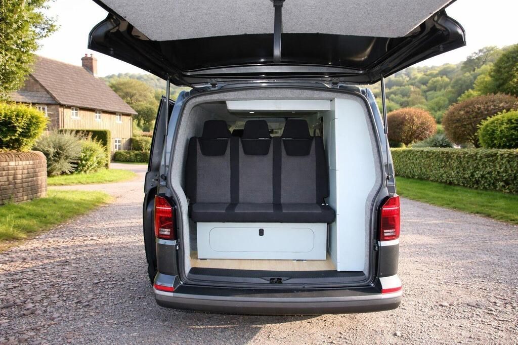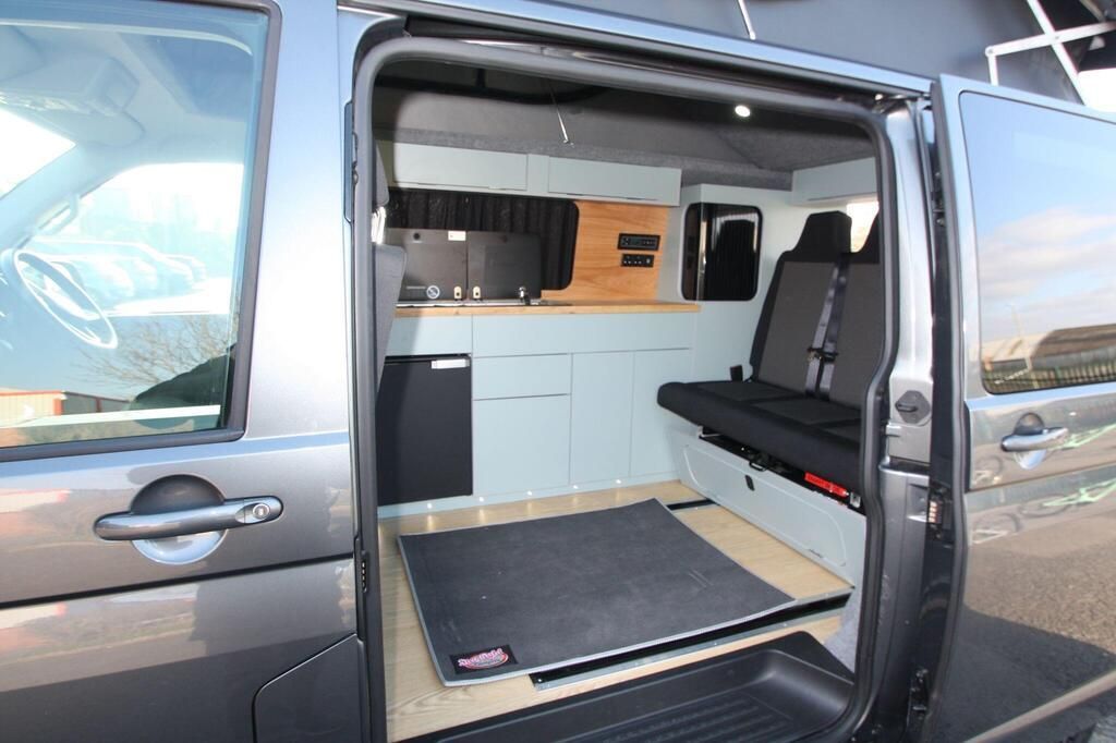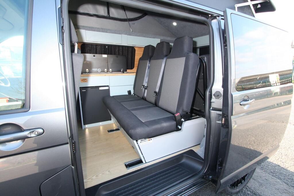Smart bed 3 seater crash tested bed. Rail bed with lwb rails for extra boot room. Full bespoke starlight campers 12v and 240v hook up system and leisure battery, fully insulated birch ply door cards, sink 2 burner and gas hob. Elevating tuv approved roof dimmable interior lighting finished in smoke trim and altro flooring.