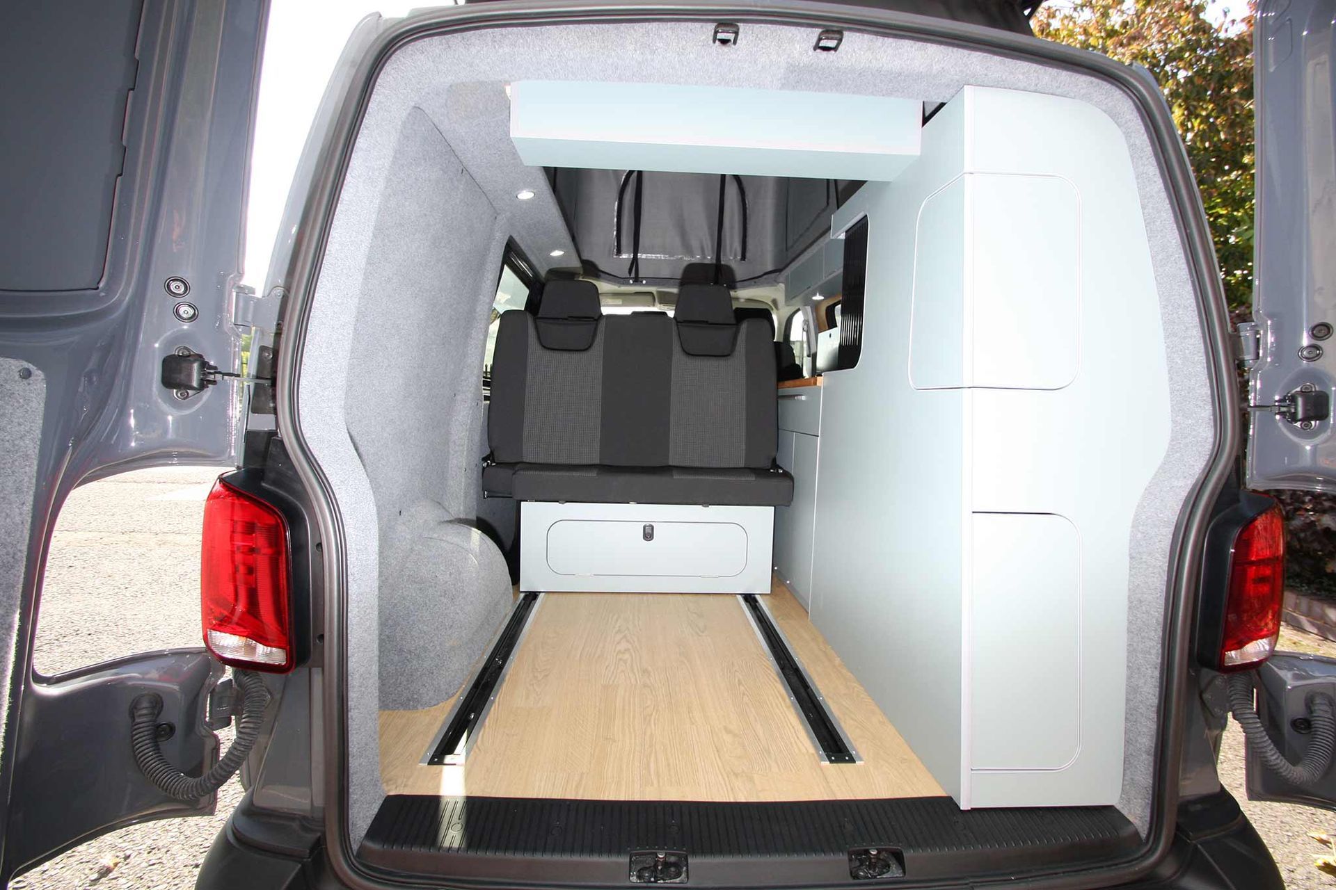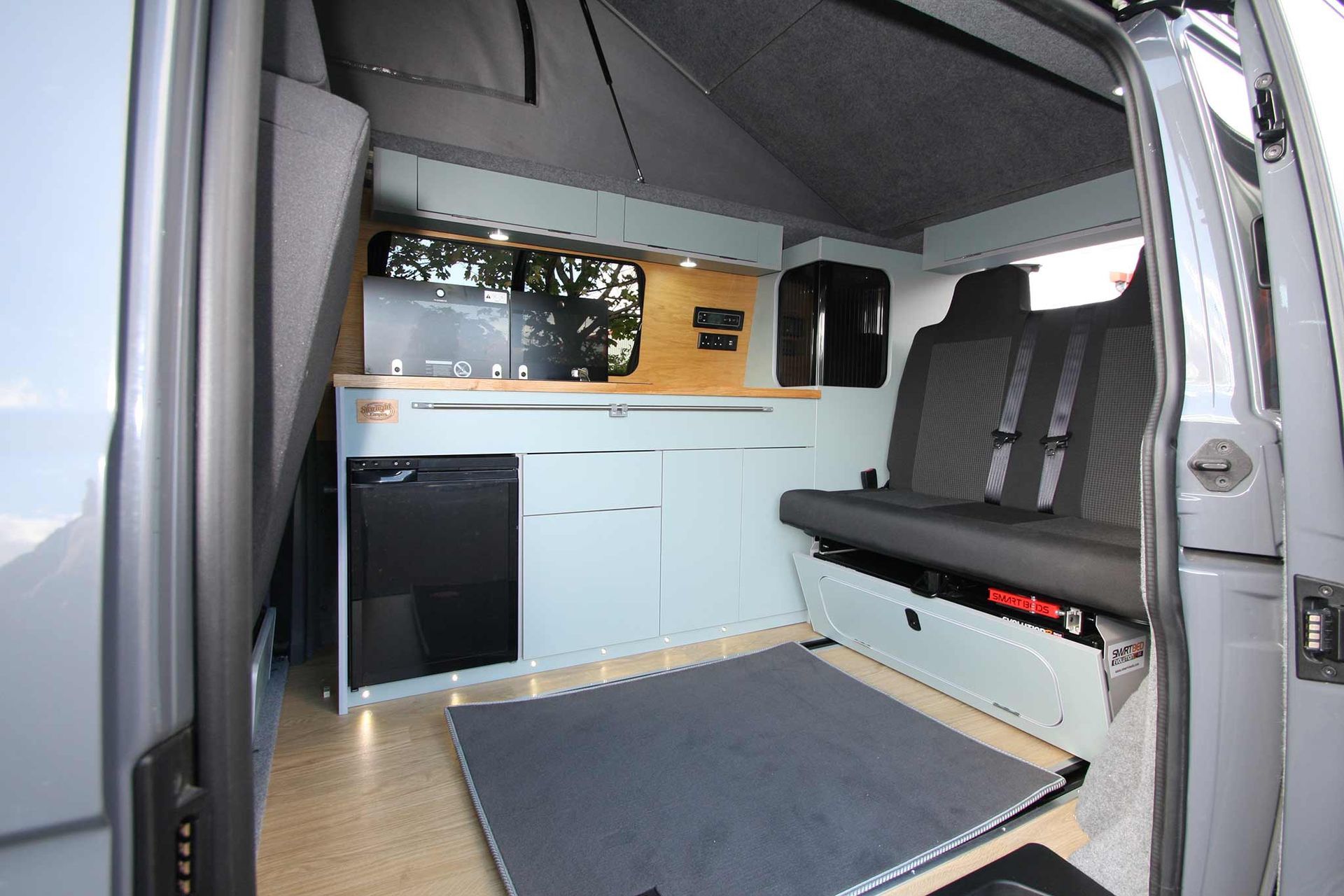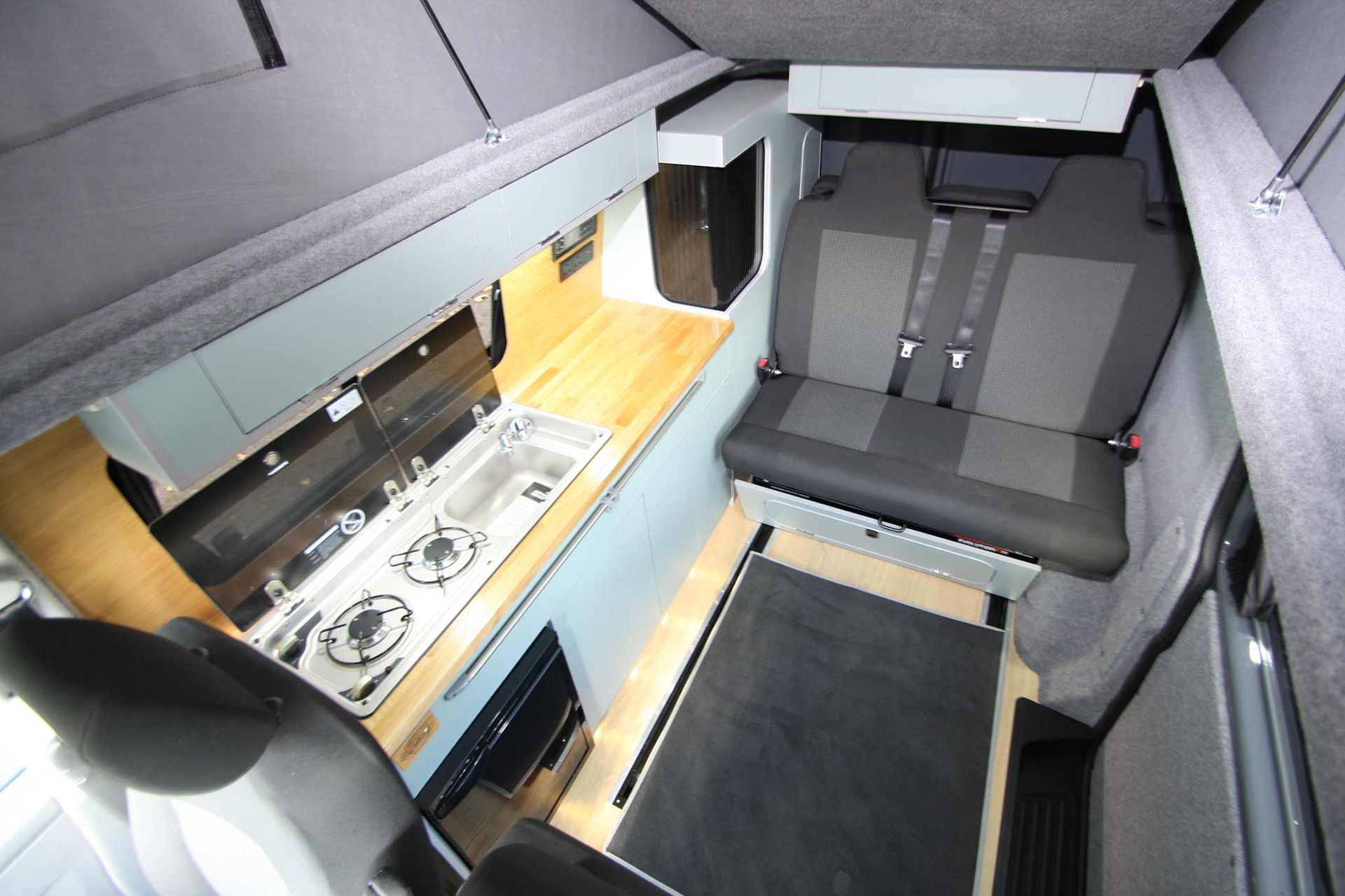 The Calipso will allow you to get a great living area choosing the colours that are right for you. The van is fully insulated carpet trimmed and windows which then lead to the units running down the side of the van all hand built and scribed to your van with additional colour worktop options and extra kick out unit space.