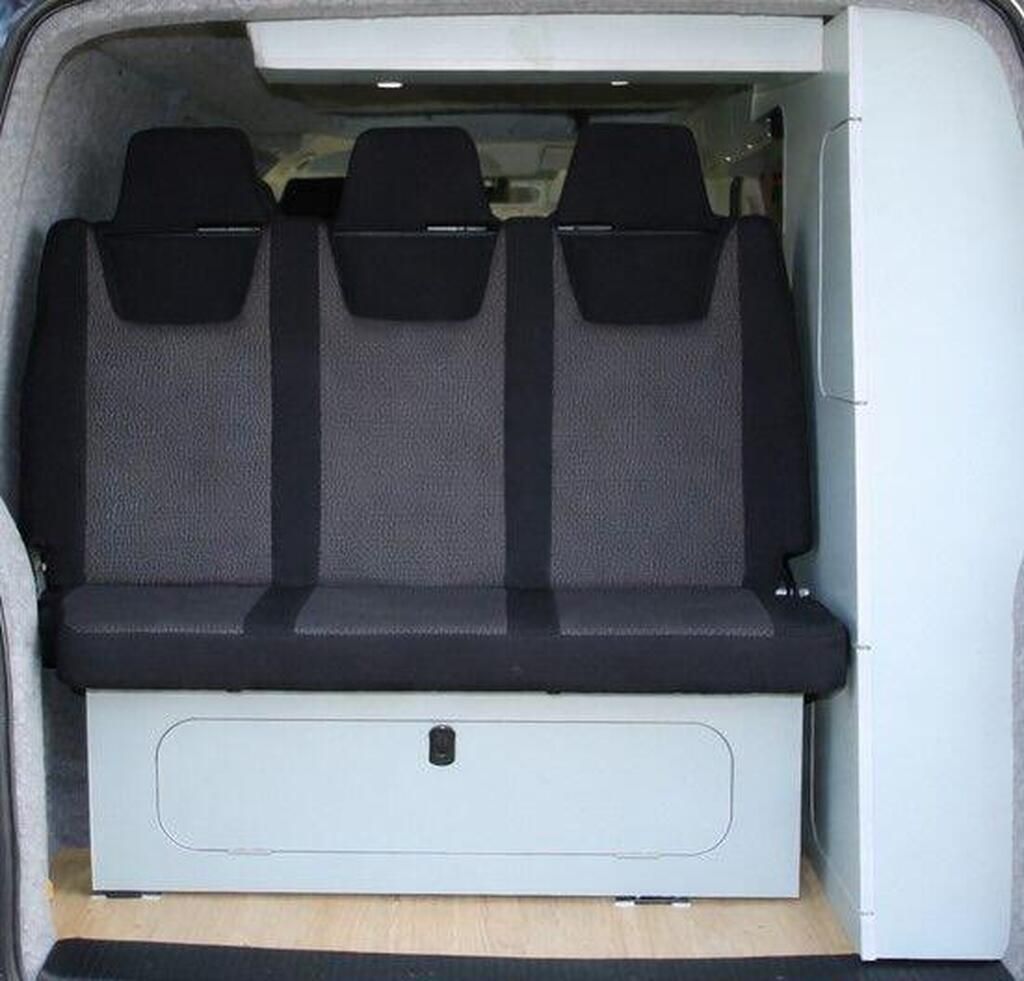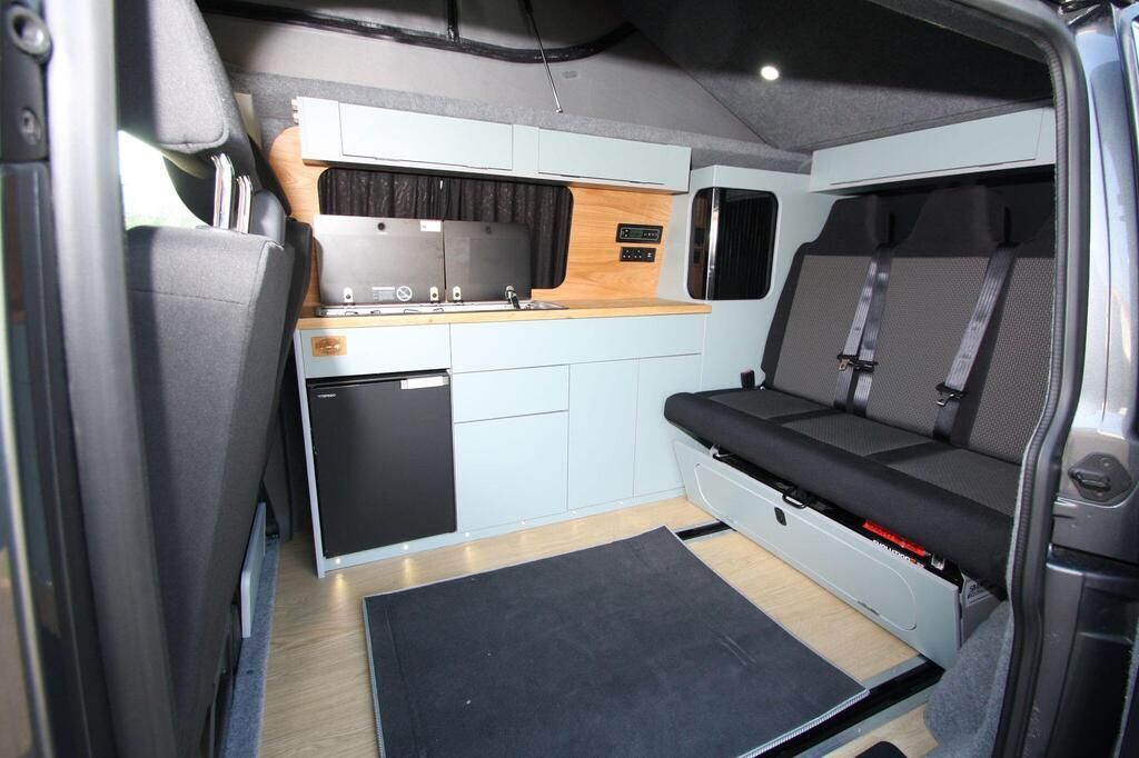 Stunning Grey Highline DSG camper with starlight campers Envision interior with a solid oak work top. Smart bed 3 seater crash tested bed. Rail bed with lwb rails for extra boot room.