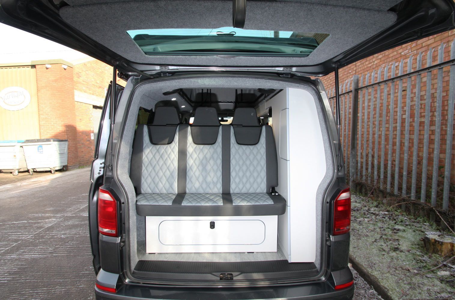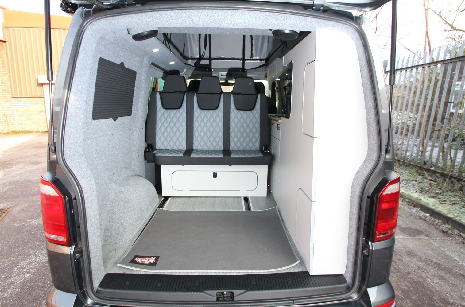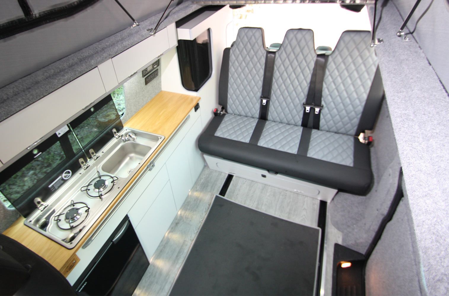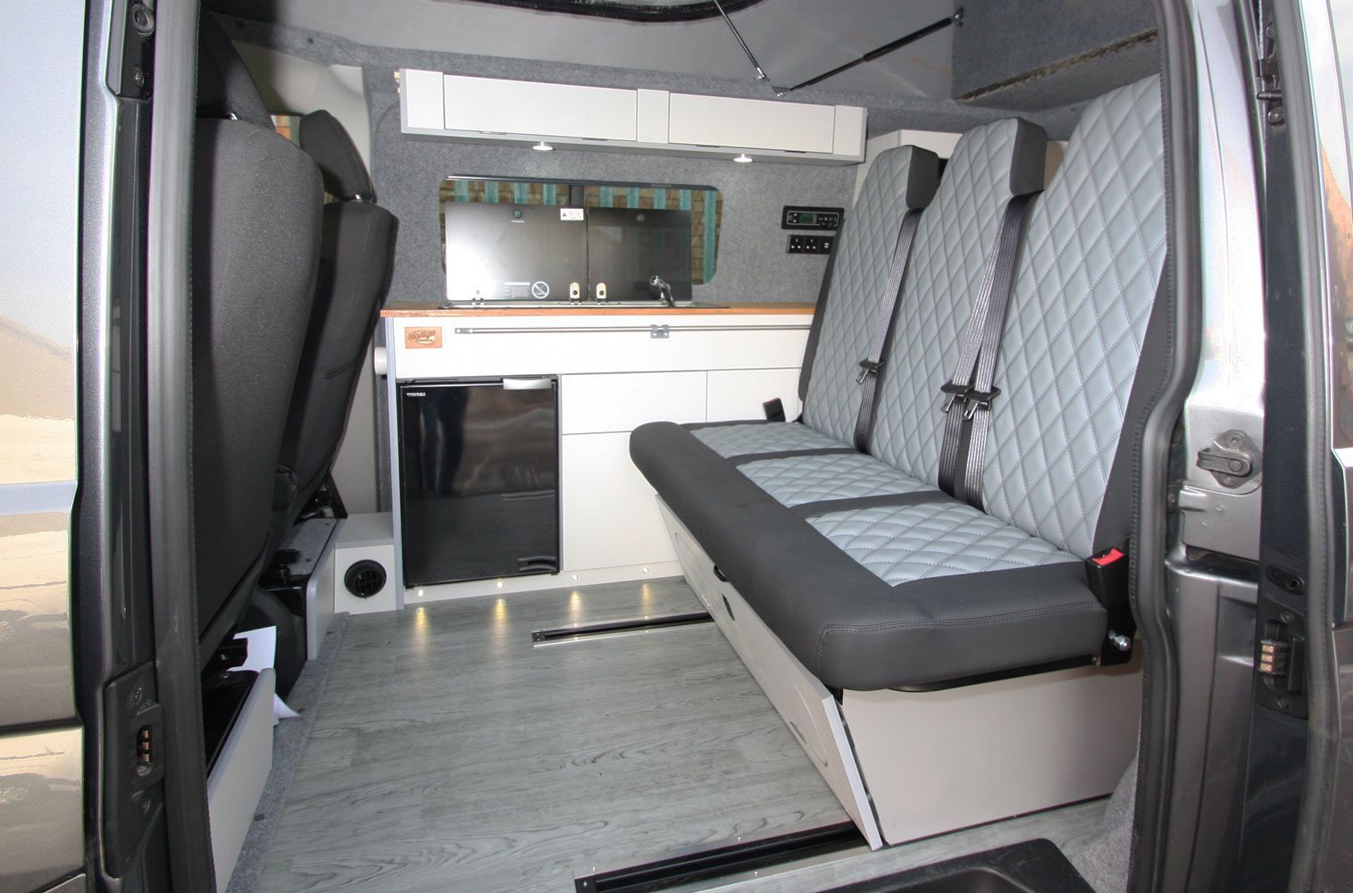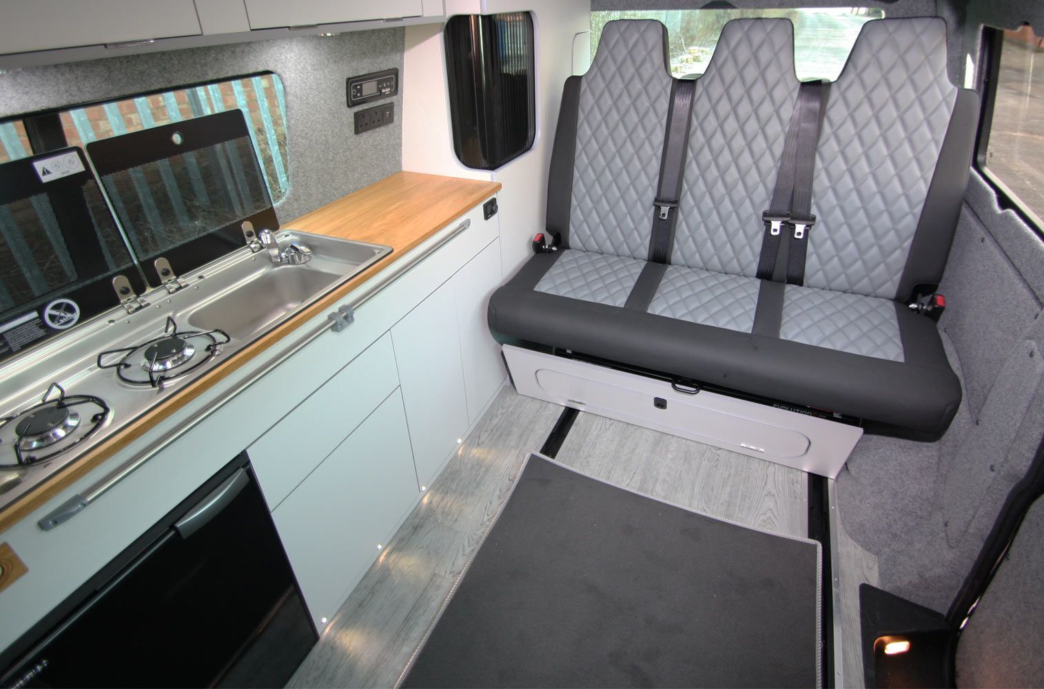 The van is fully insulated carpet trimmed and windows which then lead to the units running down the side of the van all hand built and scribed to your van with additional colour work top options and extra kick out unit space above the fridge to create extra worktop area leading to the side of the units to your rock and roll bed with deluxe upholstery leg role and front moving bed panel and rear removable bed panels which has racked positions on your seat and easy pneumatic bed to seating movement to make life easy and simple for you to use.