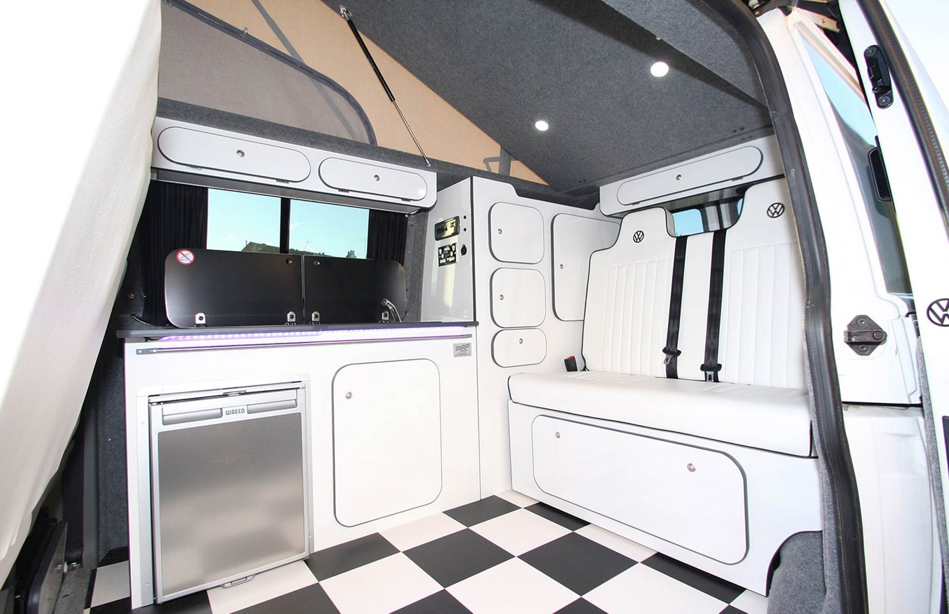 We then move up to the fully TUV approved elevating roof creating a great high space with lots of standing area windows to let that light in and a double bed. Lighting is all controlled by starlight campers own electric system using sargent control panel to create a great electric system without taking up lots of internal cupboard space. Additional options can be added or some great styling and audio options.