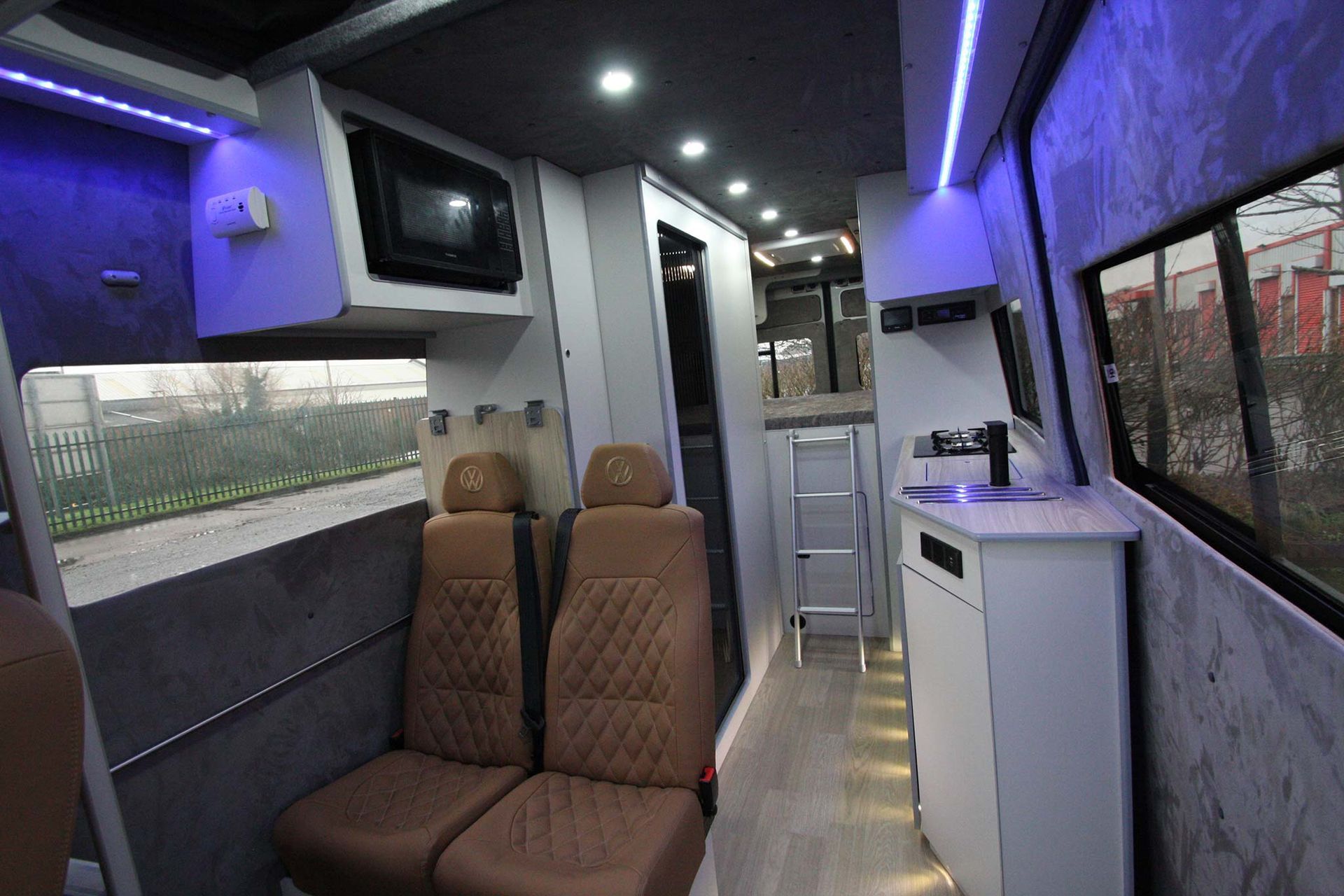 The Gensis is modern layout for LWB VW Crafter Van Conversions giving you a great space with a large bed and living accommodation to kick back and enjoy your van and the surroundings wherever you park up, also including starlight campers 3 year warranty