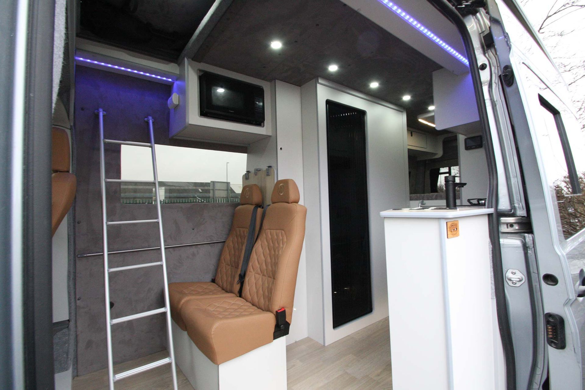 When you look at designing your van it can be a fun but scary process to get the correct layout design and colours. The Artemis will allow you to get a great living area choosing the colours that are right for you. The van is fully insulated carpet trimmed and windows which then lead to a full working walk in shower room toilet and wash area, the units running down the side of the van all hand built and scribed to your van with additional colour worktop options and extra upper units for maximum storage space large fridge and freezer with lift up w top sides to create extra worktop space, windows down the side of the van to create lots of natural light full hot and cold water system and skylight with fan to create a fantastic bright space.