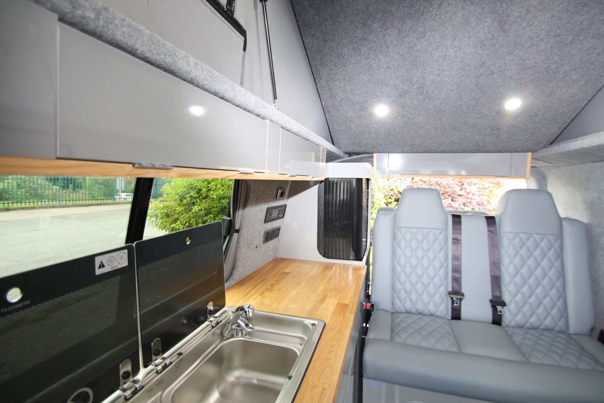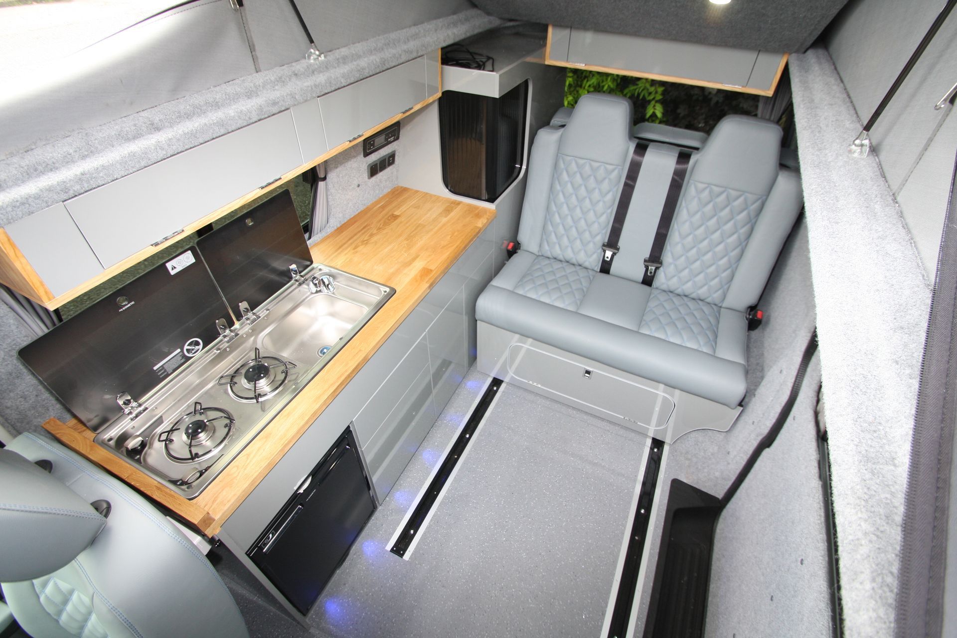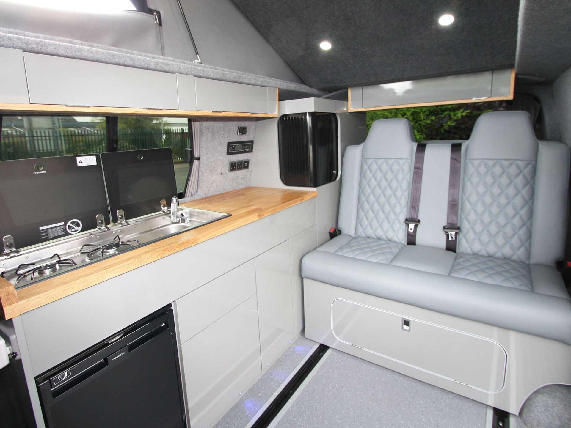 The van is fully insulated carpet trimmed and windows which then lead to the units running down the side of the van all hand built and scribed to your van with additional colour worktop options and extra kick out unit space. Above the fridge to create extra worktop area leading to the side of the units to your rock and roll bed with deluxe upholstery leg role and front moving bed panel and rear removable bed panels which has racked positions on your seat and easy pneumatic bed to seating movement to make life easy and simple for you to use.