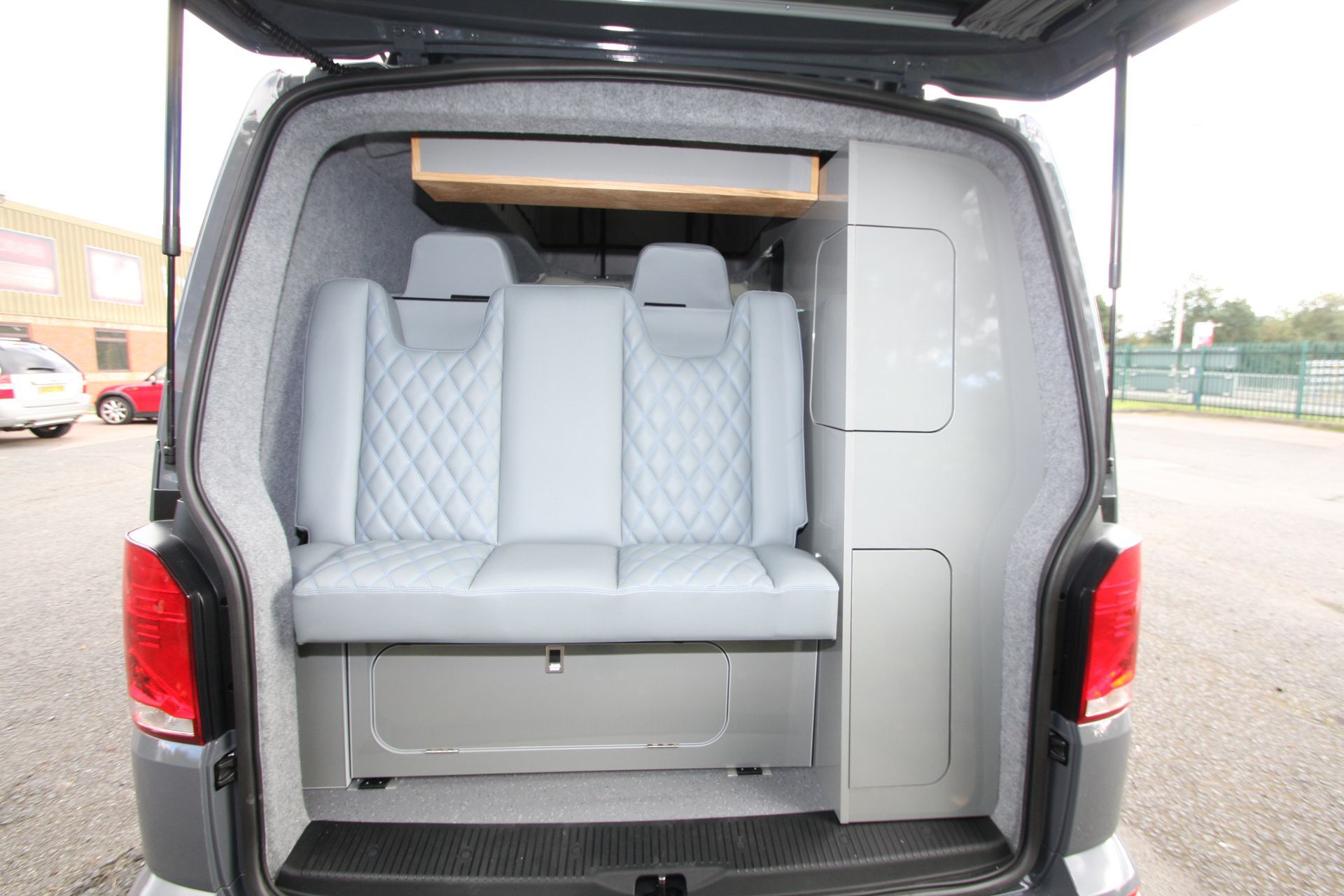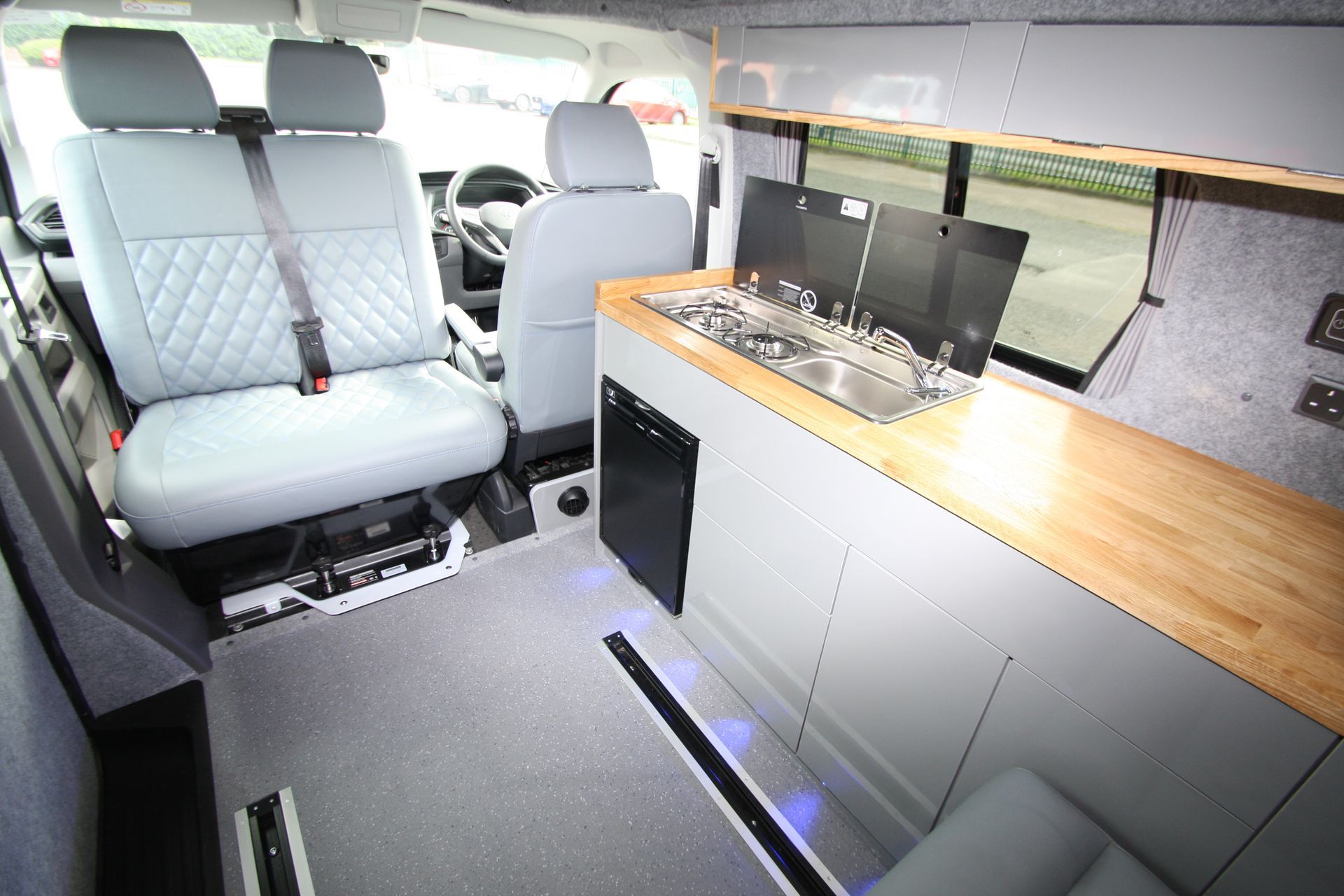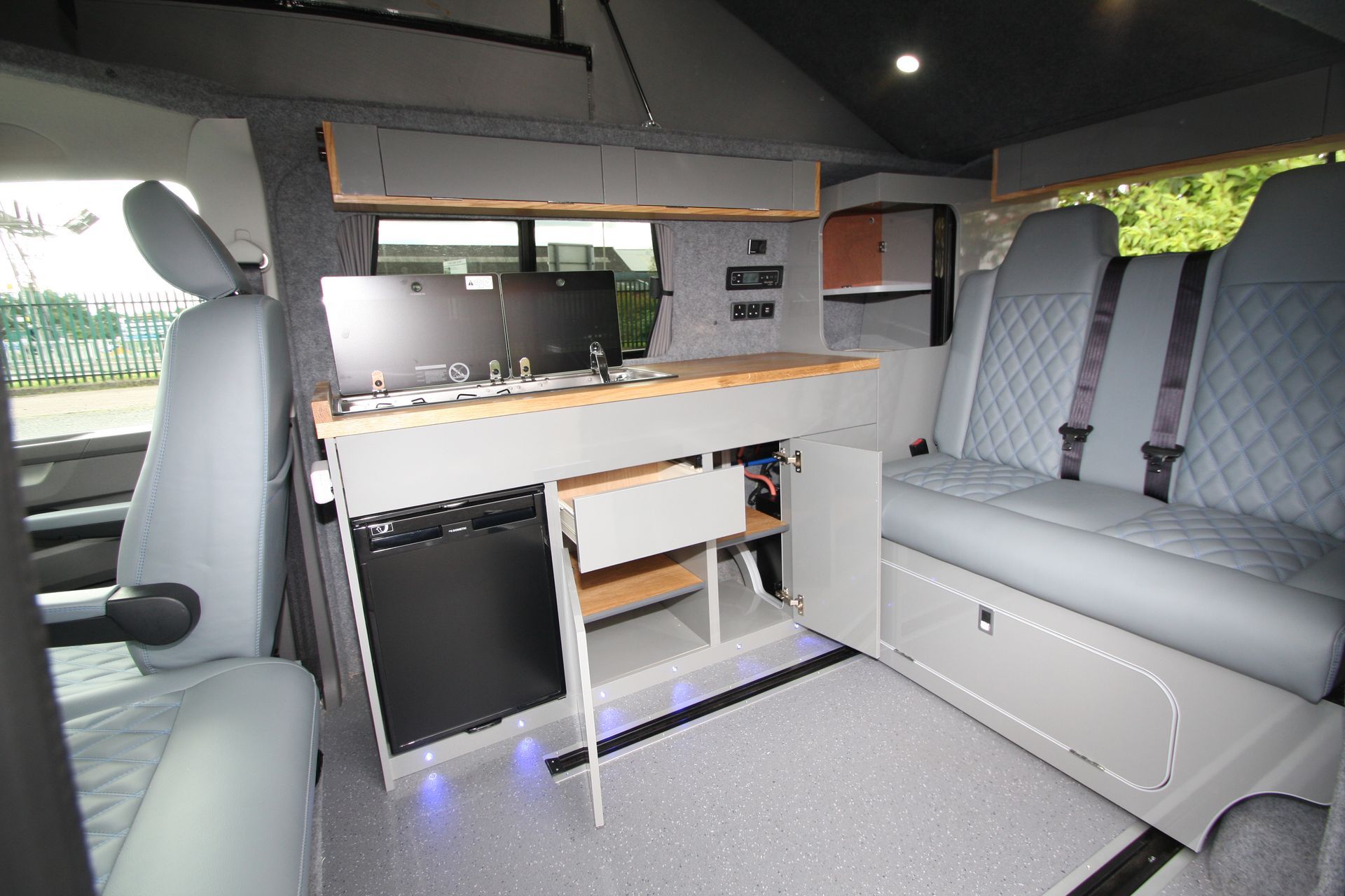 The van is fully insulated carpet trimmed and windows which then lead to the units running down the side of the van all hand built and scribed to your van with additional colour worktop options and extra kick out unit space. Above the fridge to create extra worktop area leading to the side of the units to your rock and roll bed with deluxe upholstery leg role and front moving bed panel and rear removable bed panels which has racked positions on your seat and easy pneumatic bed to seating movement to make life easy and simple for you to use.